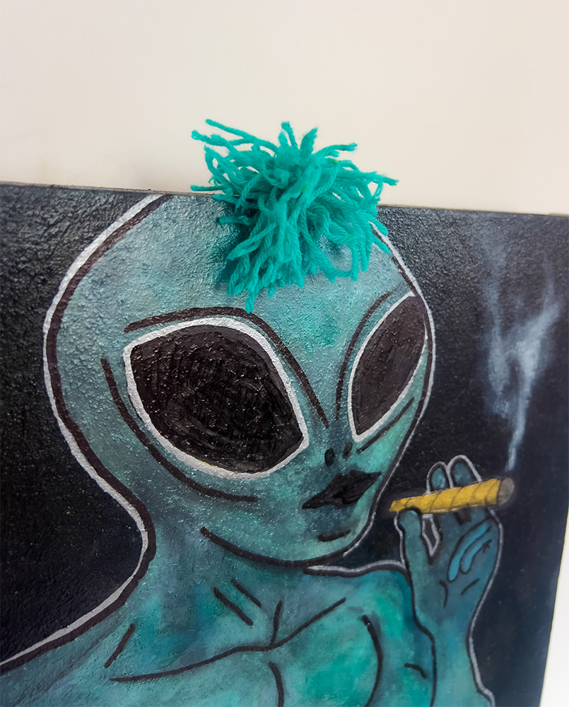 „HIGHLIEN“ zeigt ein Alien in einem Zustand zwischen Präsenz und Entrückung. Ruhig. Wach. Und doch woanders. Der Körper wirkt kraftvoll, fast übermenschlich, die Haltung entspannt, der Blick nach innen gerichtet. Der Rauch steigt langsam auf, aber nicht als Provokation, sondern als Symbol für Bewusstsein, Wahrnehmung und Perspektivwechsel. „HIGHLIEN“ spielt mit Gegensätzen: Stärke und Sanftheit. Klarheit und Schweben. Kontrolle und Loslassen. Das kleinere Format verstärkt die Intimität des Moments. Man tritt näher heran. Man schaut genauer hin. Und merkt: Dieses Alien ist kein Fremder, es ist ein Spiegel innerer Zustände. Ein Werk über Bewusstsein, Körperlichkeit und die feine Linie zwischen Realität und innerem Kosmos.