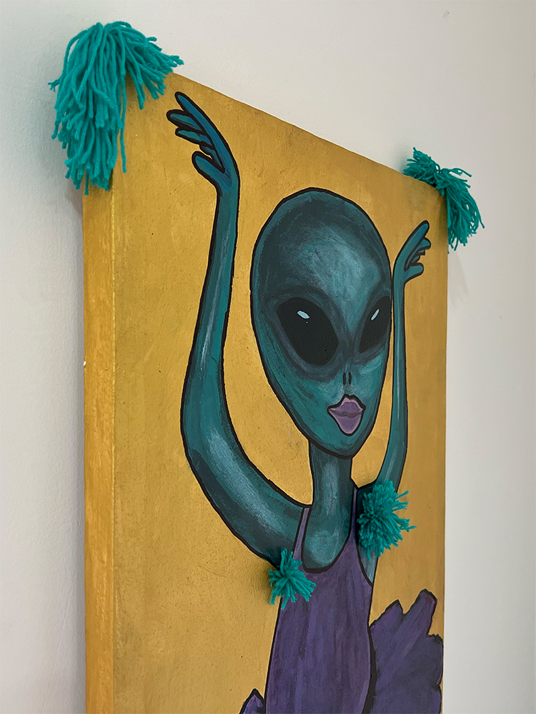 „DENTALIEN“ zeigt ein Alien in einem alltäglichen, fast banalen Moment: Zähneputzen im Badezimmer. Doch genau darin liegt die Magie. Das Bild spielt mit dem Kontrast zwischen dem Fremden und dem Vertrauten. Ein außerirdisches Wesen, das dieselben Routinen hat wie wir. Hygiene. Pflege. Bewusstsein. Das besondere Detail: Die echte Zahnbürste, die direkt im Bild verarbeitet wurde. Kein gemalter Pinselstrich, sondern ein reales Objekt. Ein Stück Echtheit, das die Grenze zwischen Kunst und Realität aufbricht. „DENTALIEN“ ist humorvoll, leicht absurd und gleichzeitig tiefgründig. Es erinnert daran, dass wir alle, egal wie fremd oder anders wir erscheinen – in denselben kleinen Momenten existieren. Ein Werk über Menschlichkeit, Alltäglichkeit und das Alien in uns selbst.