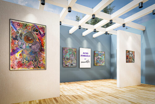 Ein wildes Kaleidoskop der Fantasie: „DRUGSBUNNY“ ist Teil der Serie Acid Animals, in der vertraute Tiere überdreht, mutiert und zwischen Albtraum und Comic explodieren. Das Hasenmotiv – verzerrt, bunt und mit überdimensionalen Augen – wirkt wie ein Spiegel einer überreizten Welt.