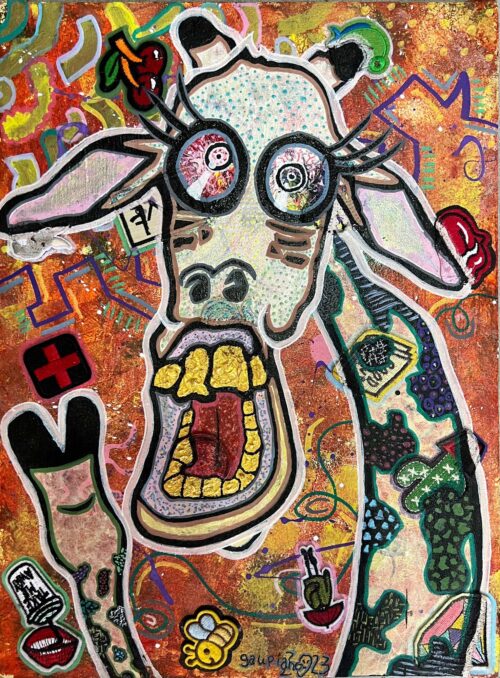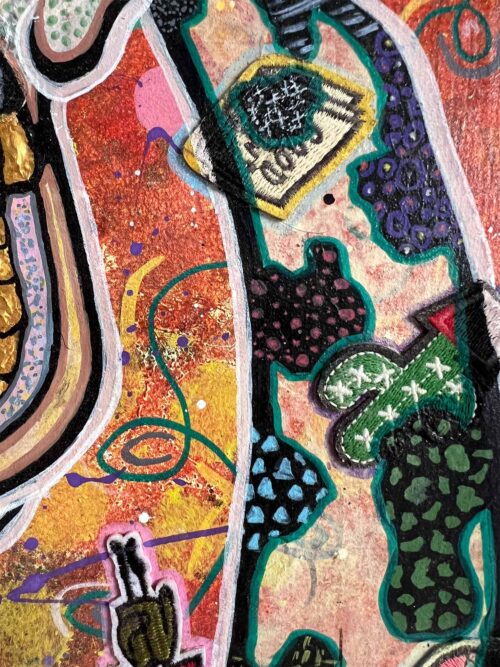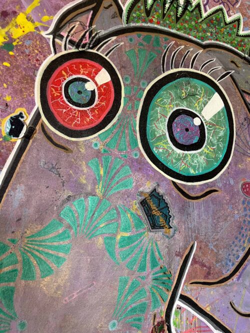 Zwischen leuchtenden Farben, Pizzastücken, Cartoon-Symbolen und verspielten Details entfaltet sich ein Universum, das gleichermaßen chaotisch wie kindlich verspielt wirkt. Die Collage-artige Oberfläche, die Kombination aus Acryl, Mixed Media und feinen Details, erzeugt eine vibrierende Energie, die Betrachter:innen in eine surreale Traumwelt zieht.