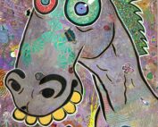 Das Pferd verliert die Kontrolle – „HORSETRIP“ ist Teil der Serie Acid Animals, in der vertraute Tiere in grellen Farben mutieren, überdrehen und zwischen Albtraum und Comic explodieren. Die Figur mit verdrehten Augen, breitem Grinsen und wildem Ausdruck reitet nicht durch Wiesen, sondern durch ein psychedelisches Chaos aus Symbolen, Mustern und popkulturellen Fragmenten. Zwischen Hotdog, Blümchen und schrillen Farbexplosionen wird das Pferd zur Ikone eines Trips, der gleichermaßen verspielt wie verstörend ist. „HORSETRIP“ ist ein Werk über Überfluss, Überdrehtheit und den schmalen Grat zwischen Freiheit und Kontrollverlust – roh, wild und kompromisslos bunt.