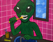 „DENTALIEN“ zeigt ein Alien in einem alltäglichen, fast banalen Moment: Zähneputzen im Badezimmer. Doch genau darin liegt die Magie. Das Bild spielt mit dem Kontrast zwischen dem Fremden und dem Vertrauten. Ein außerirdisches Wesen, das dieselben Routinen hat wie wir. Hygiene. Pflege. Bewusstsein. Das besondere Detail: Die echte Zahnbürste, die direkt im Bild verarbeitet wurde. Kein gemalter Pinselstrich, sondern ein reales Objekt. Ein Stück Echtheit, das die Grenze zwischen Kunst und Realität aufbricht. „DENTALIEN“ ist humorvoll, leicht absurd und gleichzeitig tiefgründig. Es erinnert daran, dass wir alle, egal wie fremd oder anders wir erscheinen – in denselben kleinen Momenten existieren. Ein Werk über Menschlichkeit, Alltäglichkeit und das Alien in uns selbst.